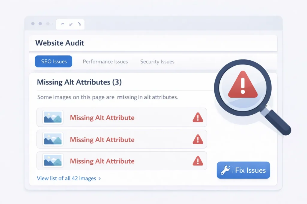Most websites fail SEO not because of content quality, but because of small technical mistakes. Missing or poorly written alt attributes are one of those mistakes. An alt text checker helps you: