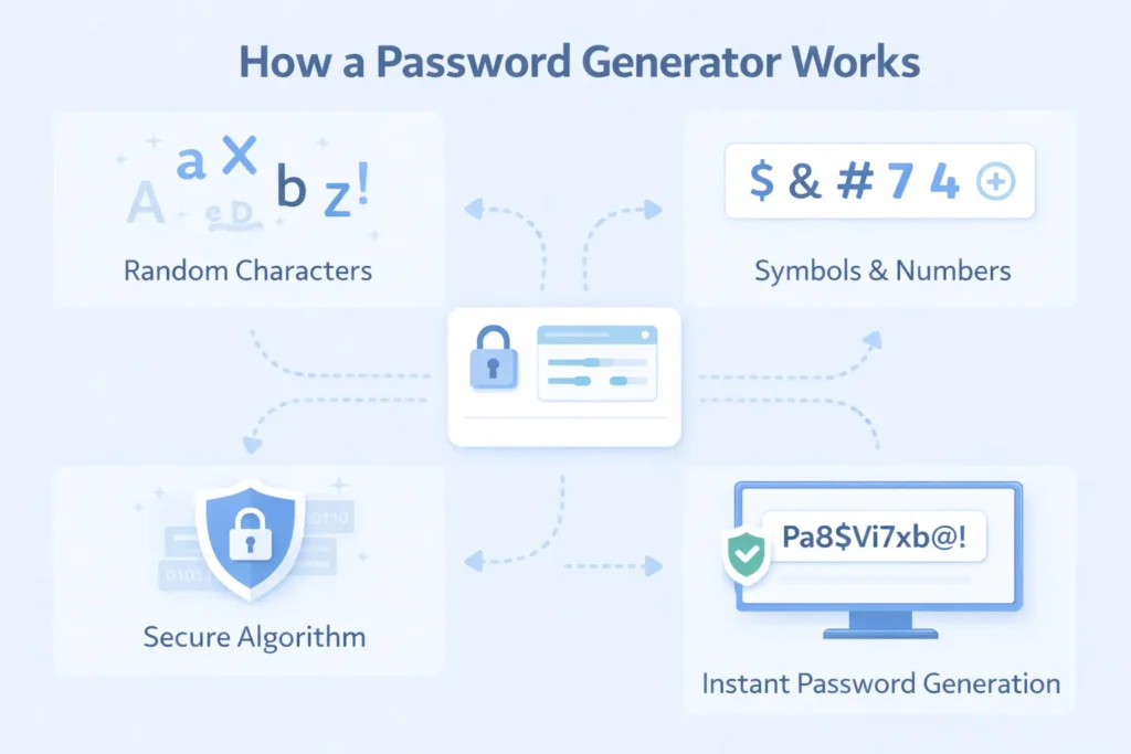 A password generator tool uses algorithms to produce random combinations of characters. These combinations have no logical pattern, which makes them extremely difficult to crack.