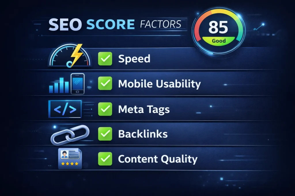 A Website SEO Score Checker evaluates your site’s overall search engine optimization health by looking at key factors like meta tags, page speed, heading structure, mobile responsiveness, backlinks, and content quality. These tools provide a numerical SEO score and highlight areas that need improvement to help your site rank better.