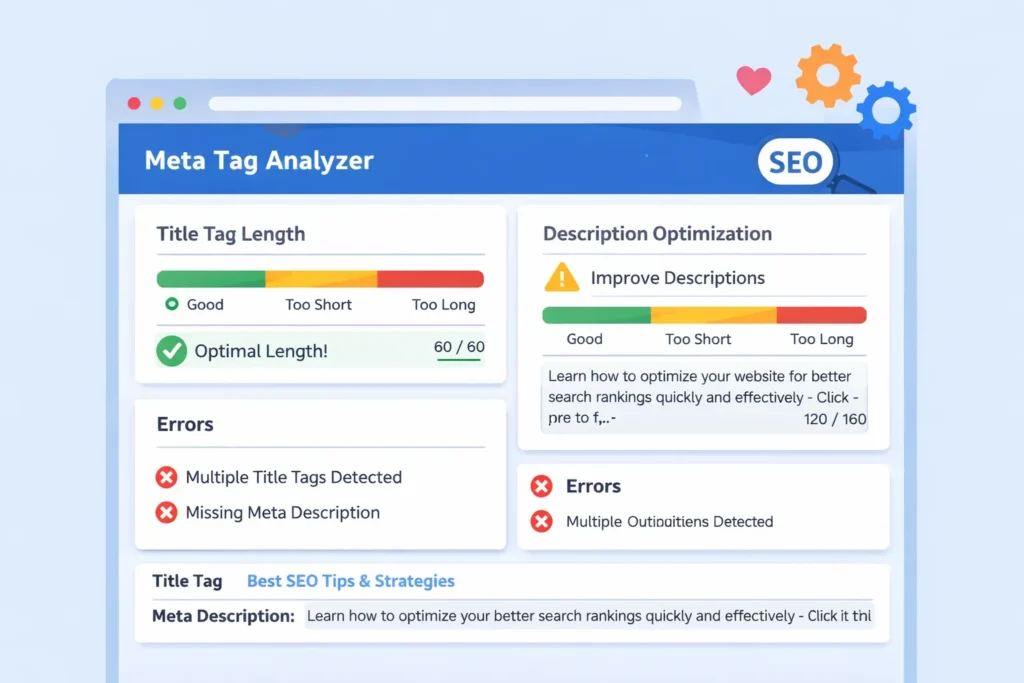Your meta tags are some of the most important on‑page SEO elements — yet many websites ignore them. A “SEO meta tag analyzer” helps you instantly spot meta tag errors and optimize them for better rankings, higher click‑through rates (CTR), and stronger search visibility.