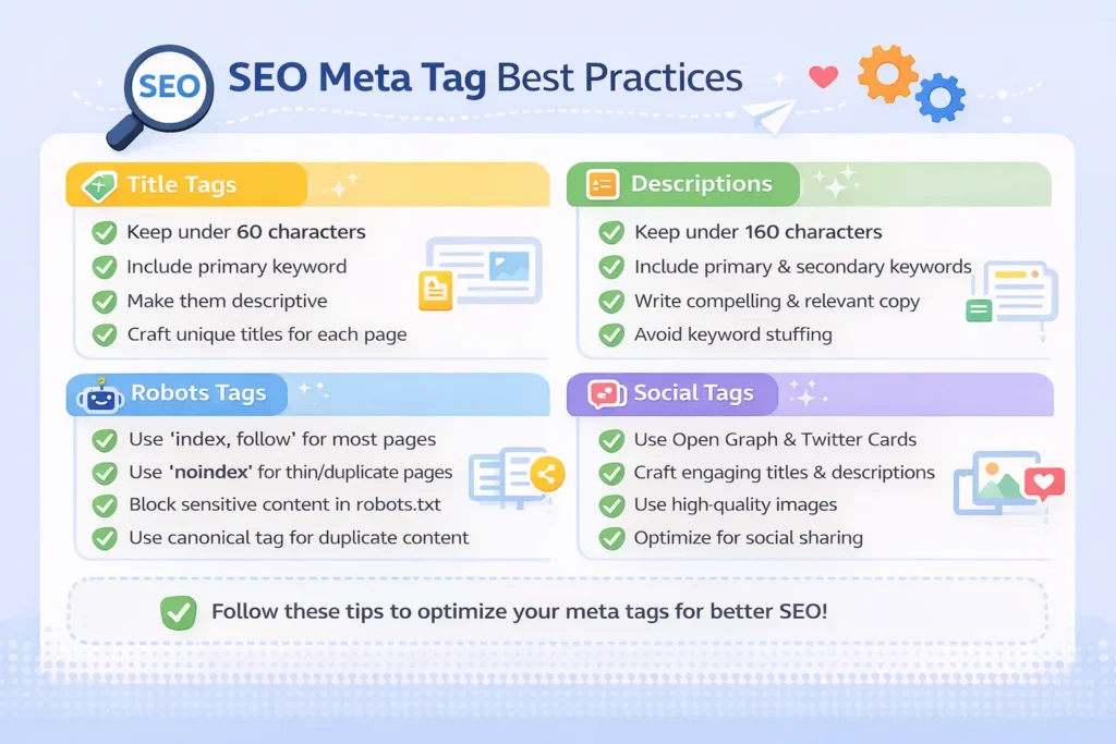Search engines use meta tags to understand what your page is about and what words describe it best. Good tags help Google index correctly.